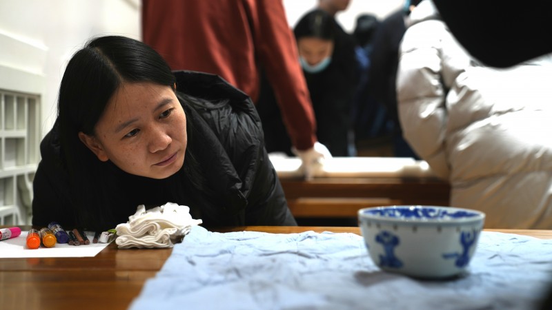 经典课程“藏品阅读”选用了故宫博物院七件藏品,涵盖陶瓷、绘画、织绣、木雕、文房用品、建筑构件、外国文物等类别。常州博物馆学员雷倩萍选择的是“青花人物故事图诸葛碗”,与其他四名学员在仔细观察这件藏品后,记录尺寸、颜色、工艺等信息,并通过生动有趣的形式演绎出“昭君出塞”“诸葛亮与司马懿”的故事。