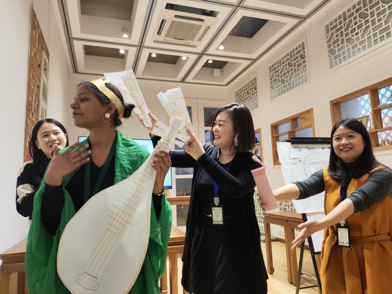 本期培训还设置了“展示汇报”环节,邀请每位学员分享本馆的一个展览案例,以增进学员间的经验分享与实践交流,雷倩萍分享了展览案例“How to bring vanishing things back”,以“腾飞之龙——从龙到鸟的演化之旅”科普展为例,分享了通过将保存精美的化石与现实生活的鸟类等动物进行形态、习性等对比,将已经逝去消失的东西通过展览重新活起来,为公众带来丰富生动的科普知识。此外,分组讨论、案例分析、模拟策展等多样化的互动授课形式也贯穿培训全程,充分调动了学员的积极性,鼓励学员发现和分享,以创造性的方式挖掘藏品价值、讲述藏品故事,并最终收获“以观众体验为中心”的策展技巧。雷倩萍连同国内外四名学员在2小时内利用每位学员从各自博物馆带来的小物品,连同现场可利用的材料,策划了名为“Searching for Power”的微型展览。展览分为三个部分:自然的力量、神话的力量和日常生活中的力量。其中自然的力量由雷倩萍负责讲解,通过从常州博物馆带来的两张自然展厅鲸鱼和猫科动物的门票图片以及乌干达学员带来的香蕉叶包裹的咖啡豆等,配以大自然波涛汹涌、电闪雷鸣的风暴音像多媒体,为大家展示大自然的强大能量以及自然界植物带给人类的力量。