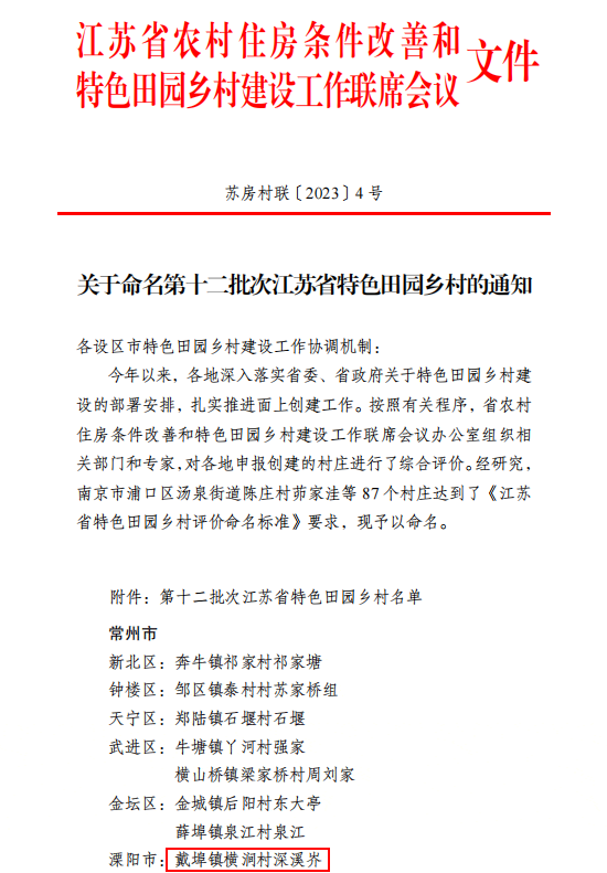 日前,戴埠镇横涧村深溪岕上榜江苏省特色田园乡村第十二批次名单。