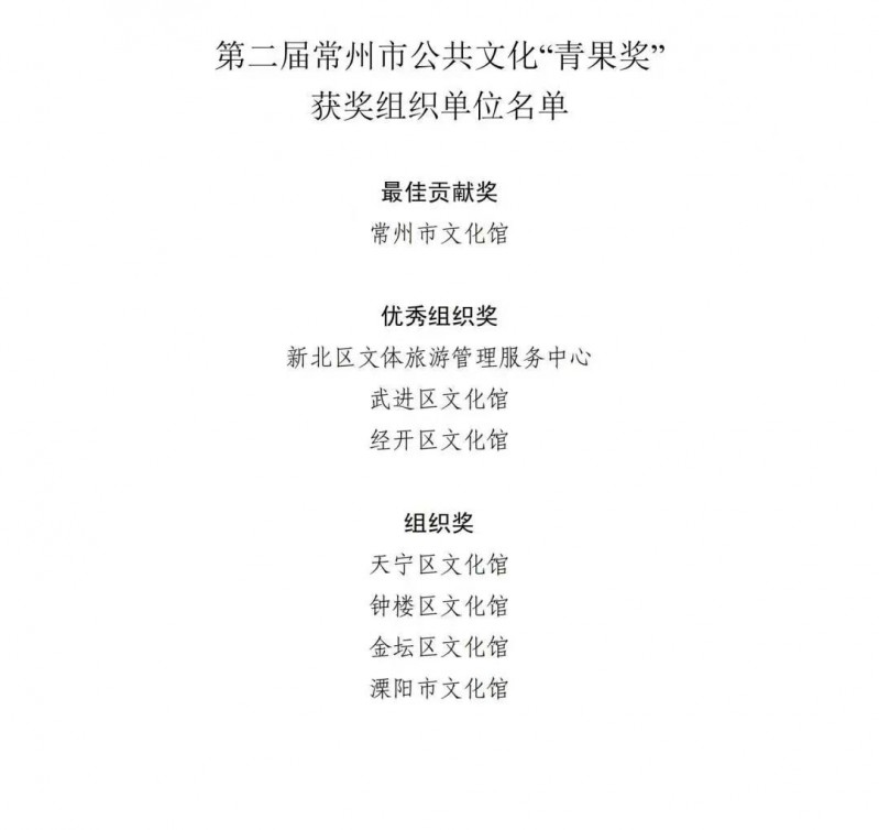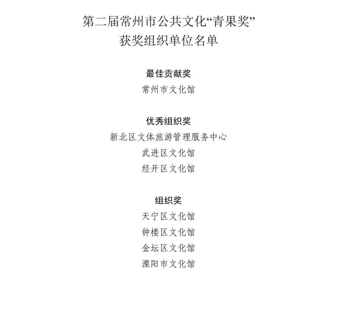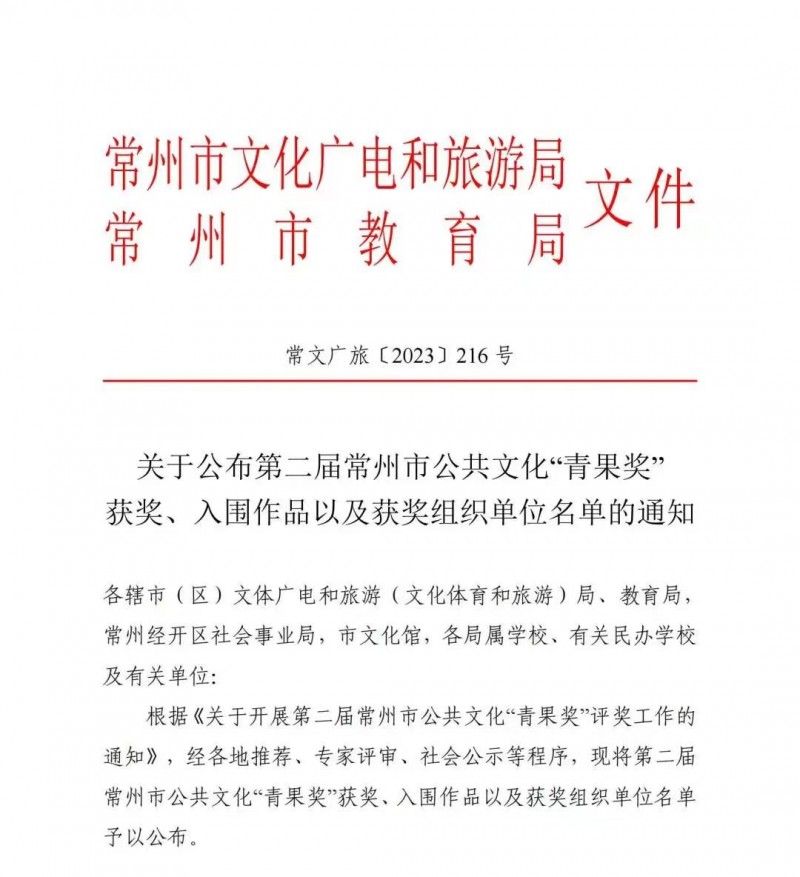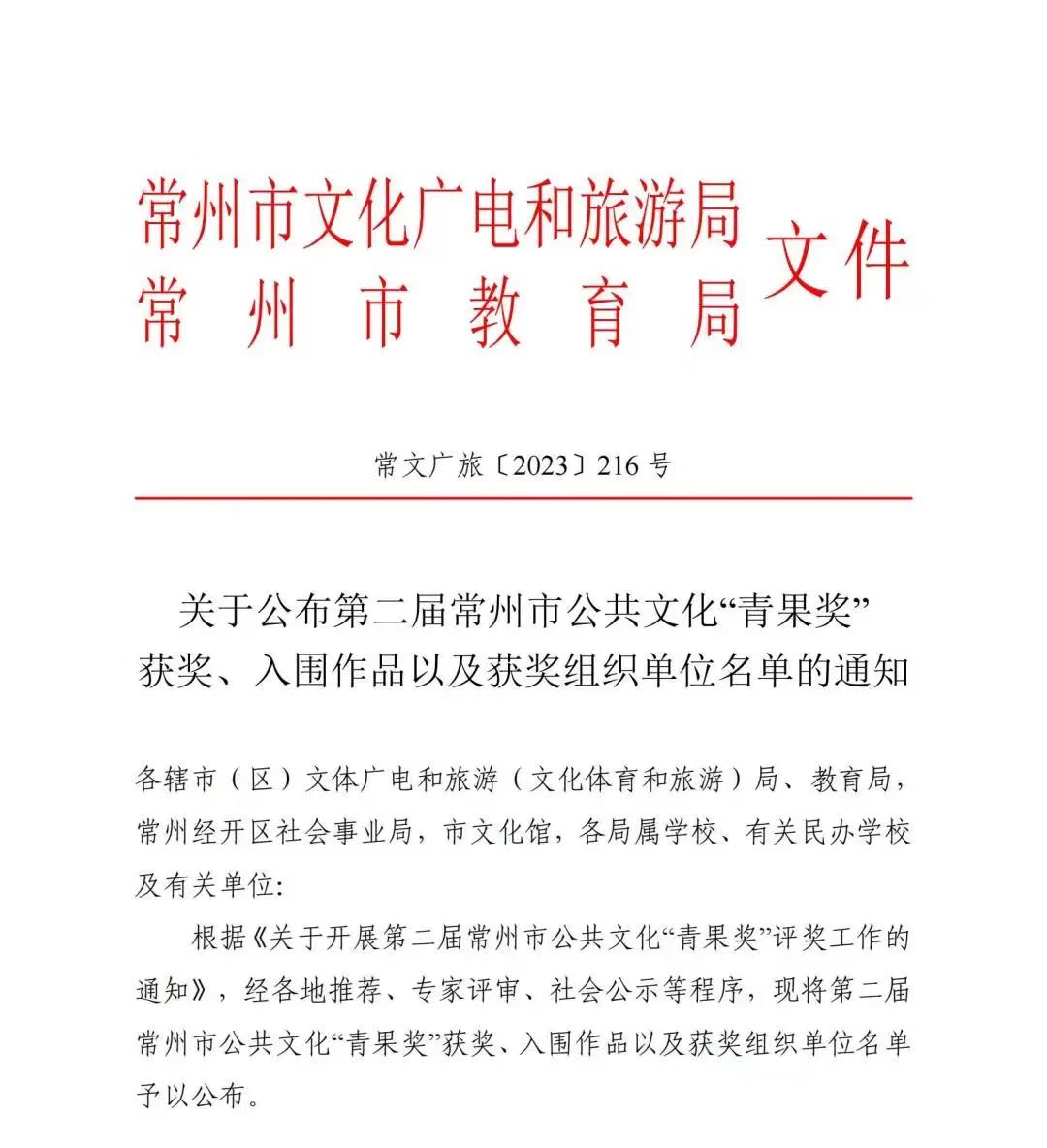 今年2月8日,市文化广电和旅游局发布《关于开展第二届常州市公共文化“青果奖”评奖工作的通知》,开启2023年度“青果奖”评奖工作。本届评奖范围在往届基础上新增群众合唱、广场舞两类,与群众文艺领域政府最高奖“群星奖”保持一致,确保“青果奖”的群众性,从而调动基层群众文艺创作和演出的积极性,促进群众文化艺术的发展。