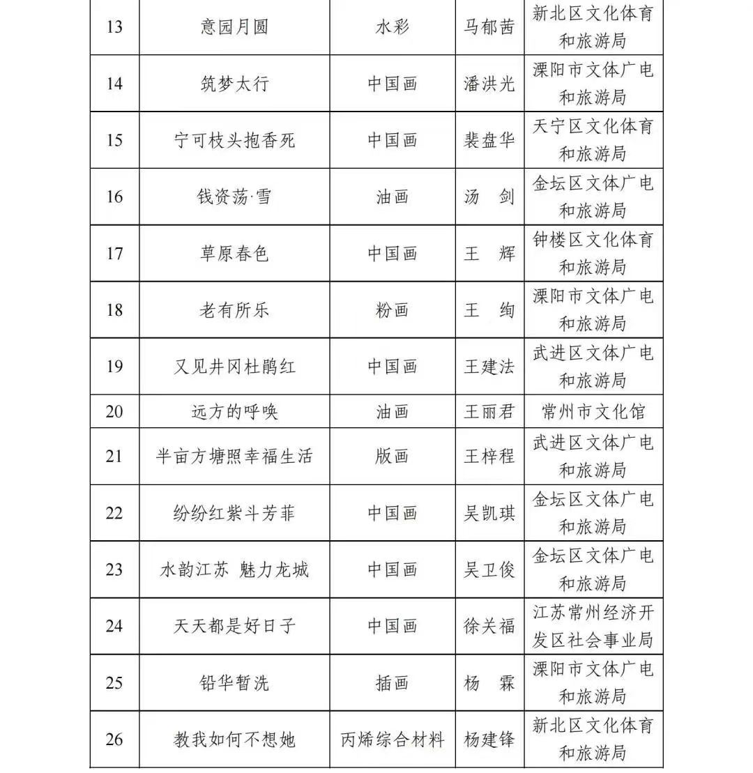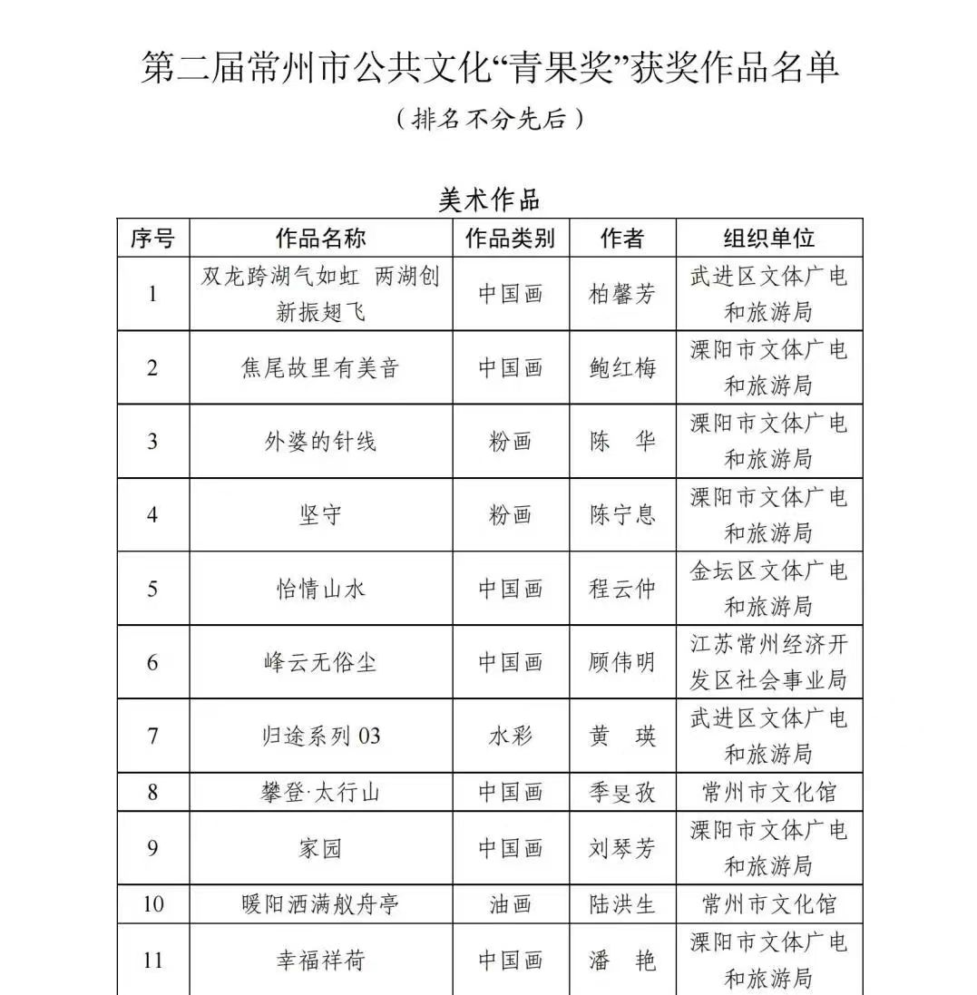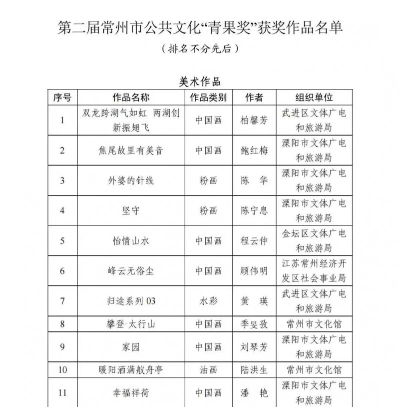 经评审,共选出“青果奖”美术类获奖作品49件其中美术作品25件、书法作品24件“青果奖”美术类入展作品59件其中美术作品34件、书法作品25件获奖、入展共108件作品在常州美术馆展出。