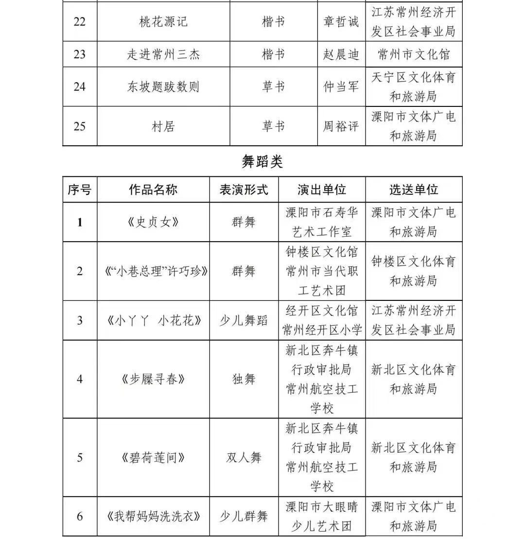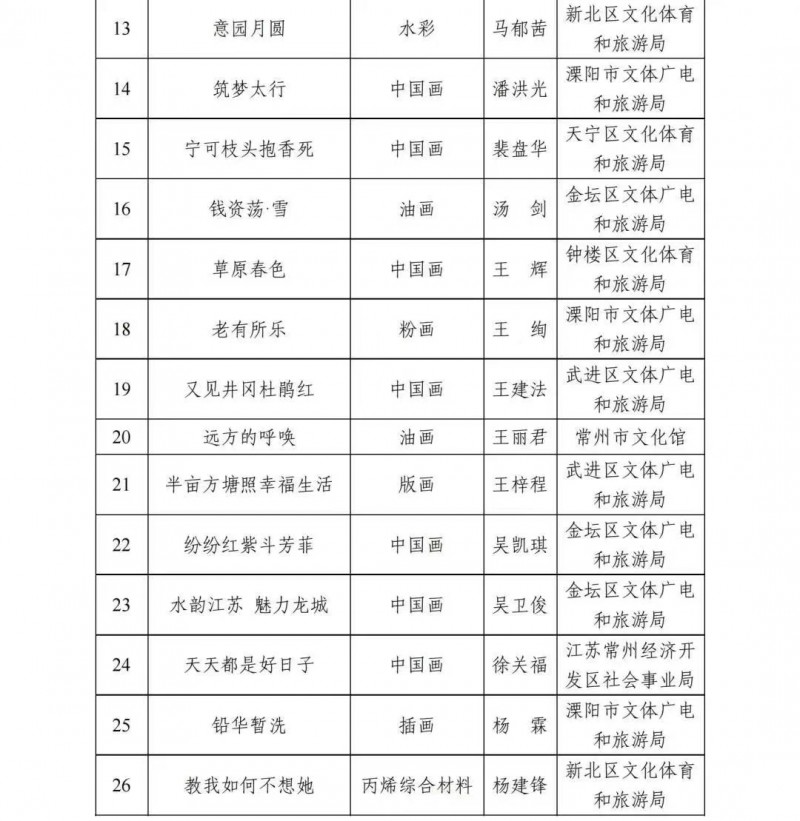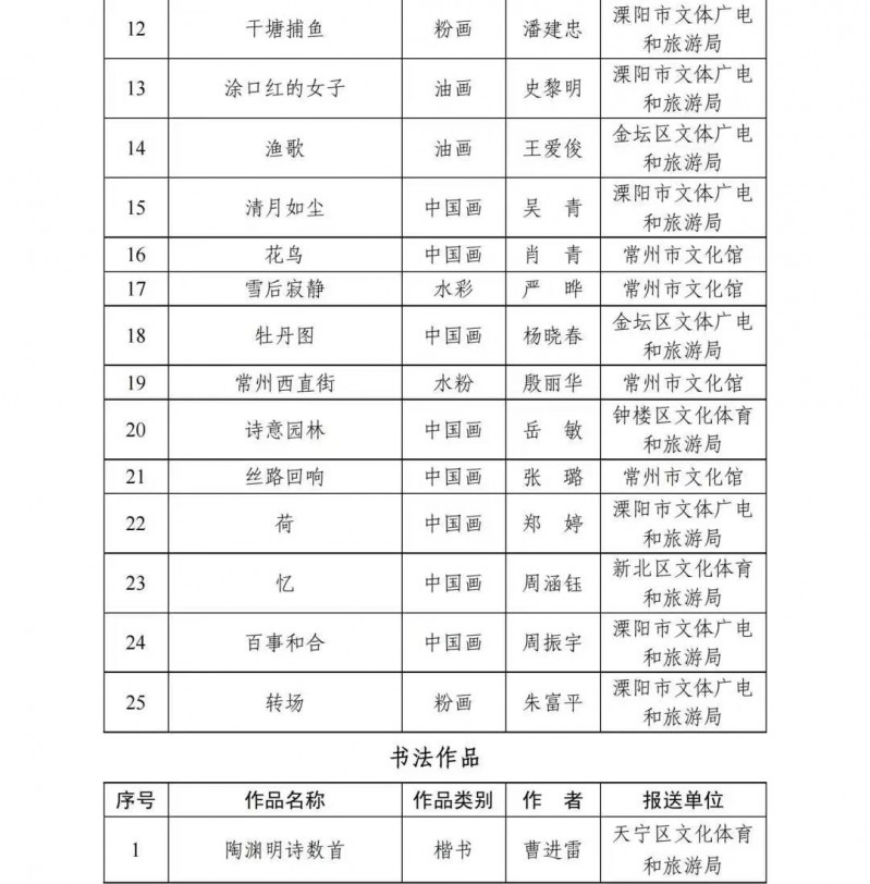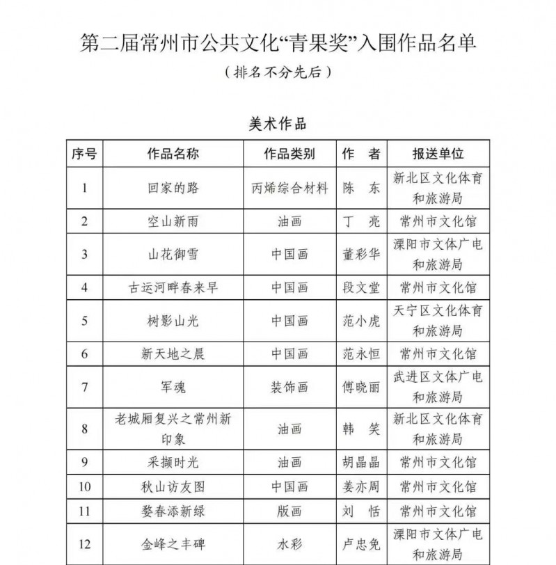 经过各辖市区局(馆)和相关单位积极组织,踊跃报名,美术类作品包括美术作品和书法作品共收到316件。舞台艺术类作品经过8月的各辖市区馆组织的第二届常州市公共文化“青果奖”初评,市级专家的精心指导,共选出合唱门类:共9件、广场舞门类:共9件、舞蹈门类:共10件、音乐门类:共15件、戏剧曲艺门类:共14件,参加第二届常州市公共文化“青果奖”舞台艺术终评。