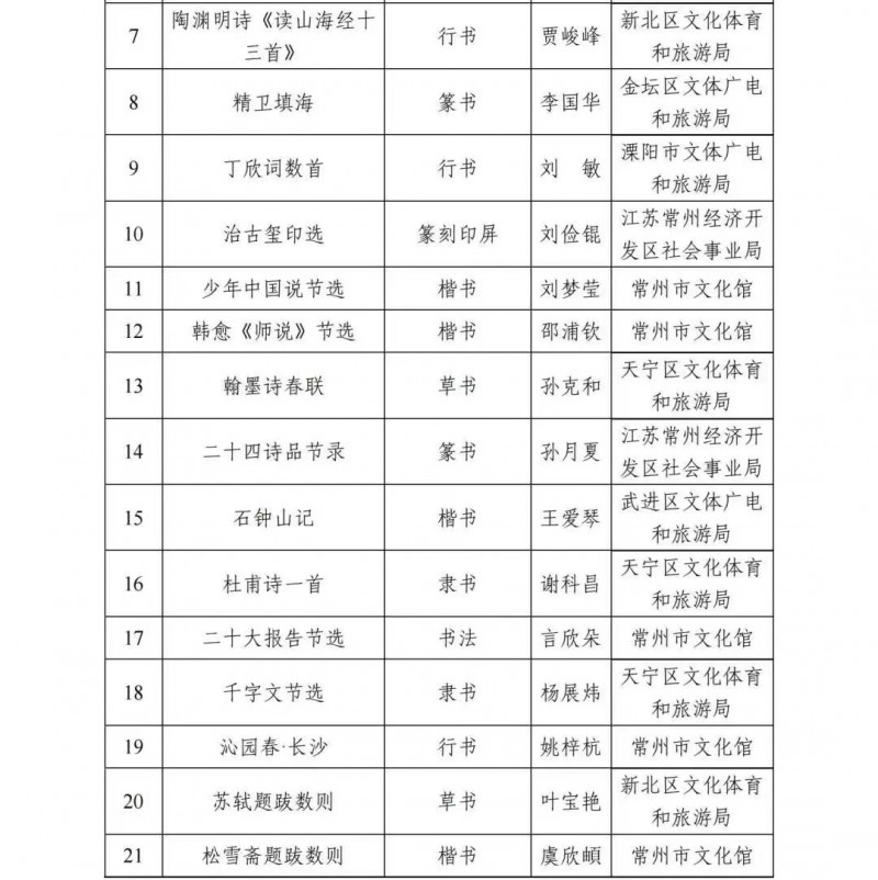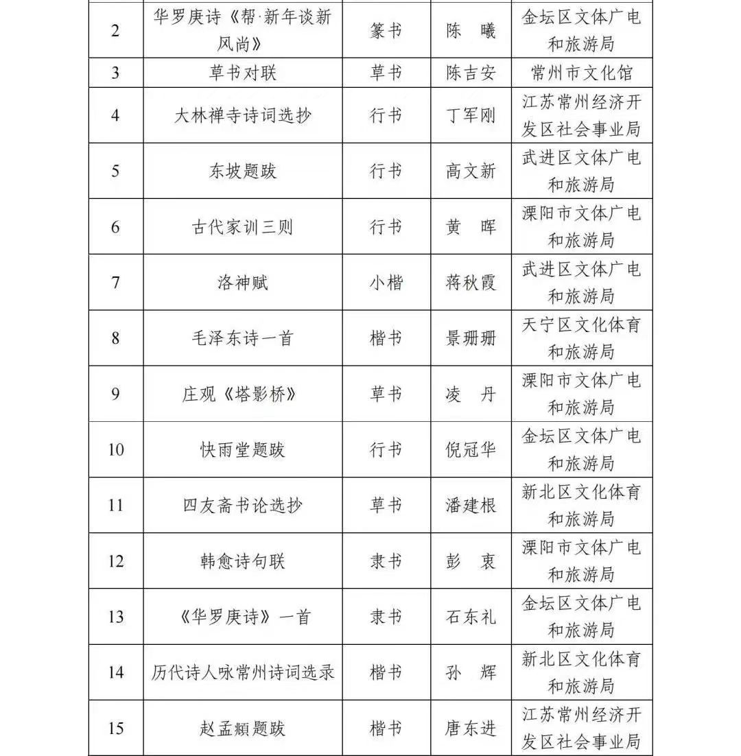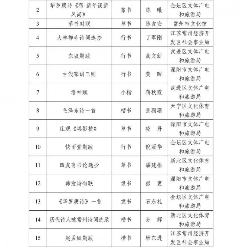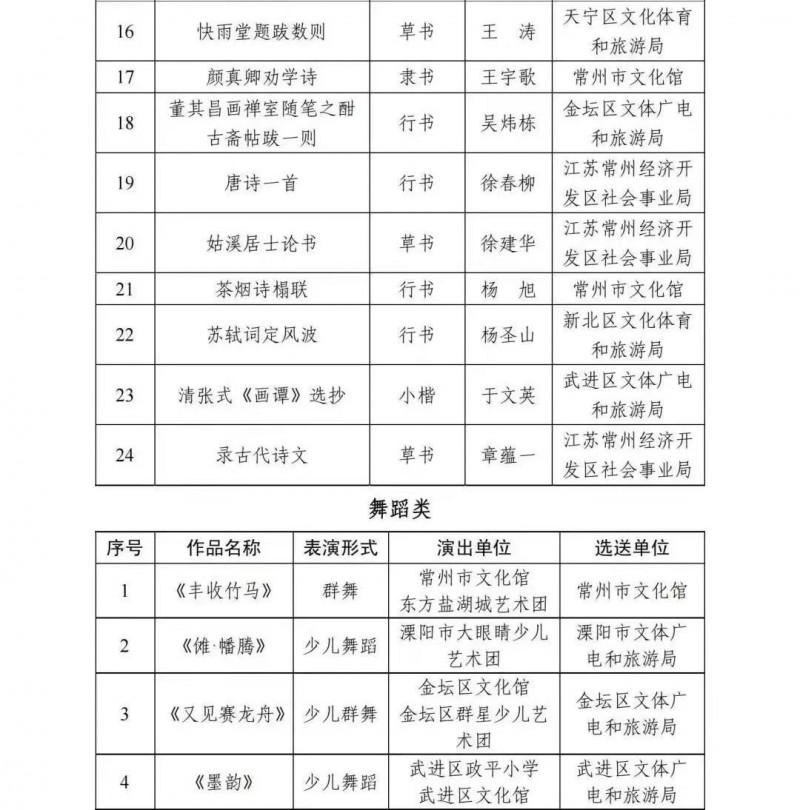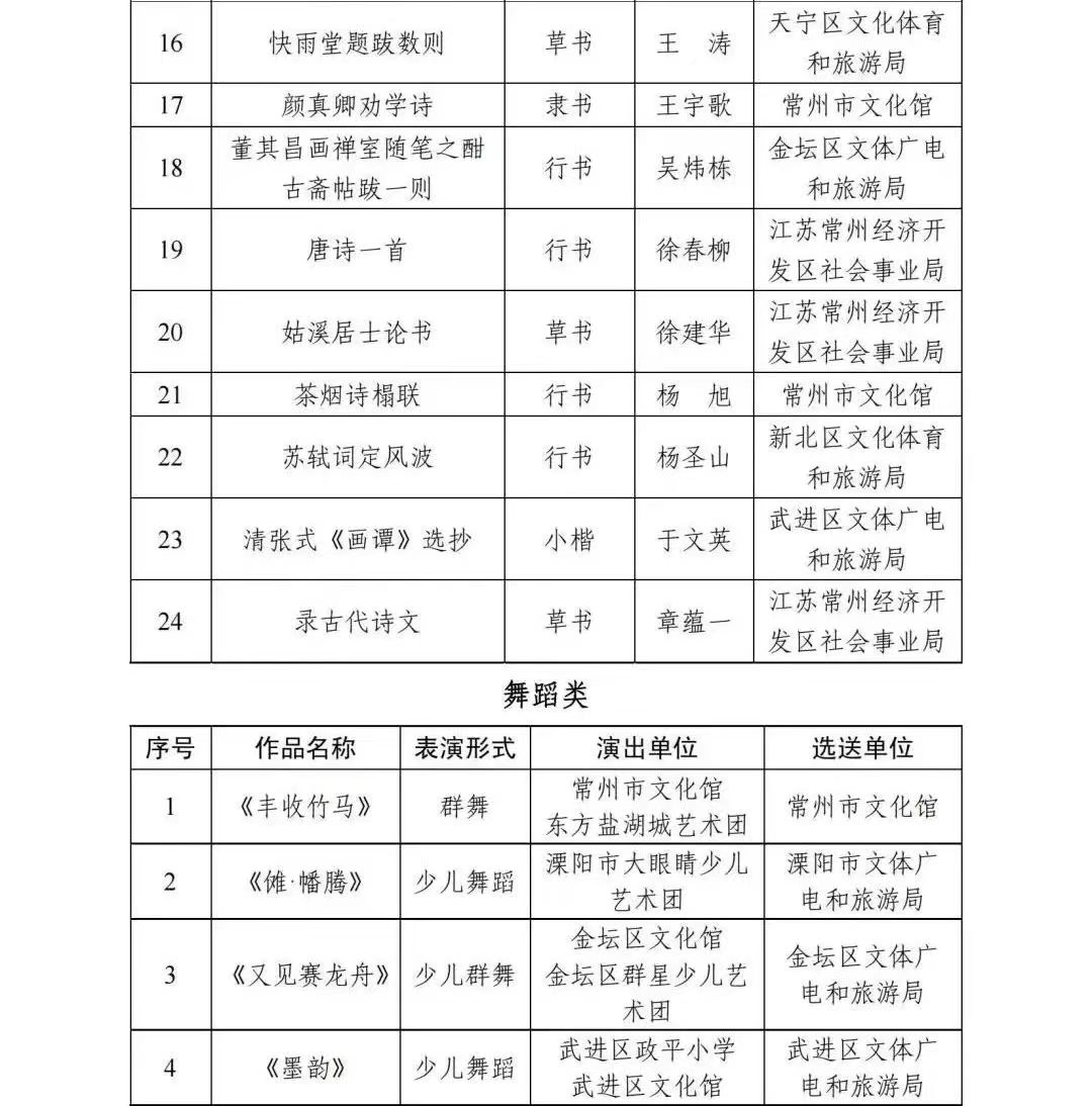 经过各辖市区局(馆)和相关单位积极组织,踊跃报名,美术类作品包括美术作品和书法作品共收到316件。舞台艺术类作品经过8月的各辖市区馆组织的第二届常州市公共文化“青果奖”初评,市级专家的精心指导,共选出合唱门类:共9件、广场舞门类:共9件、舞蹈门类:共10件、音乐门类:共15件、戏剧曲艺门类:共14件,参加第二届常州市公共文化“青果奖”舞台艺术终评。