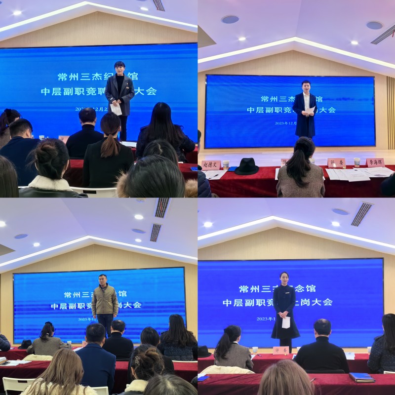 为加强干部队伍建设,激发干部队伍活力,提升中层干部队伍的整体素质和服务水平,12月22日,常州三杰纪念馆举行2023年中层副职竞聘上岗大会。四位竞聘者走上舞台,展现自我,竞聘综合科、宣传教育科、后勤保卫科三个部门的中层副职岗位。