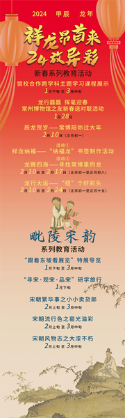 自古以来,龙文化对中华民族影响至深,在传统节日春节到来之际,我们特别策划了“祥龙昂首来 24放异彩”新春系列教育活动,期待以快乐的方式与大家同迎新春、共度佳节。主题学习课程展示、博物馆之友送对联活动、“纳福龙”书签制作活动……总有一款适合你!与此同时,围绕“毗陵·宋——文物中的宋代常州”跨年特展,精彩纷呈的“毗陵宋韵”系列教育活动也将重磅来袭,特展导览、研学旅行、主题课程……带你沉浸式体验宋文化。心动不如行动,一起来常博寻找“文化年味儿”吧!