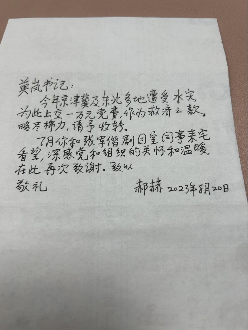 “今年京津冀及东北多地遭受水灾,为此上交一万元党费,作为救济之款,略尽绵力……”8月20日,文研所党支部书记莫岚收到了离休老党员郝赫的来信。