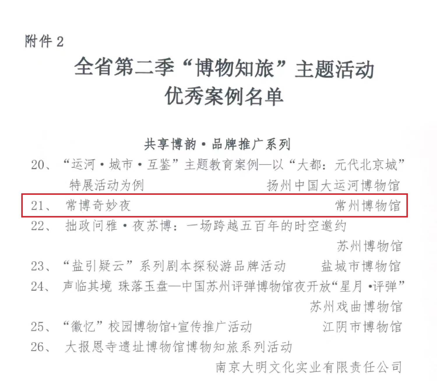 2023年7月14日-8月26日,美好如“常”大型文旅惠民行动之“常博奇妙夜”重磅来袭,常州博物馆在每周五、六延时开放至晚9点,展馆1至3层全线开放,18项45场活动轮番登场,国潮文创商品升级上线,一系列接地气、聚人气的活动,使“常博奇妙夜”成为点亮城市夜文化的流量密码。户外演出拓宽活动场域、原创剧本演绎国宝故事、首开展厅化石修复课程、联结社区凸显人文关怀……更为“夜生活”的主力军年轻群体定制读书、摄影、艺术相关的主题沙龙。“常博奇妙夜”以宣传地方文化为内核,以赋能夜经济为驱动,以系列活动为抓手,将文化与社交、休闲、旅游有机融合,促进了文化资源的有效增值。