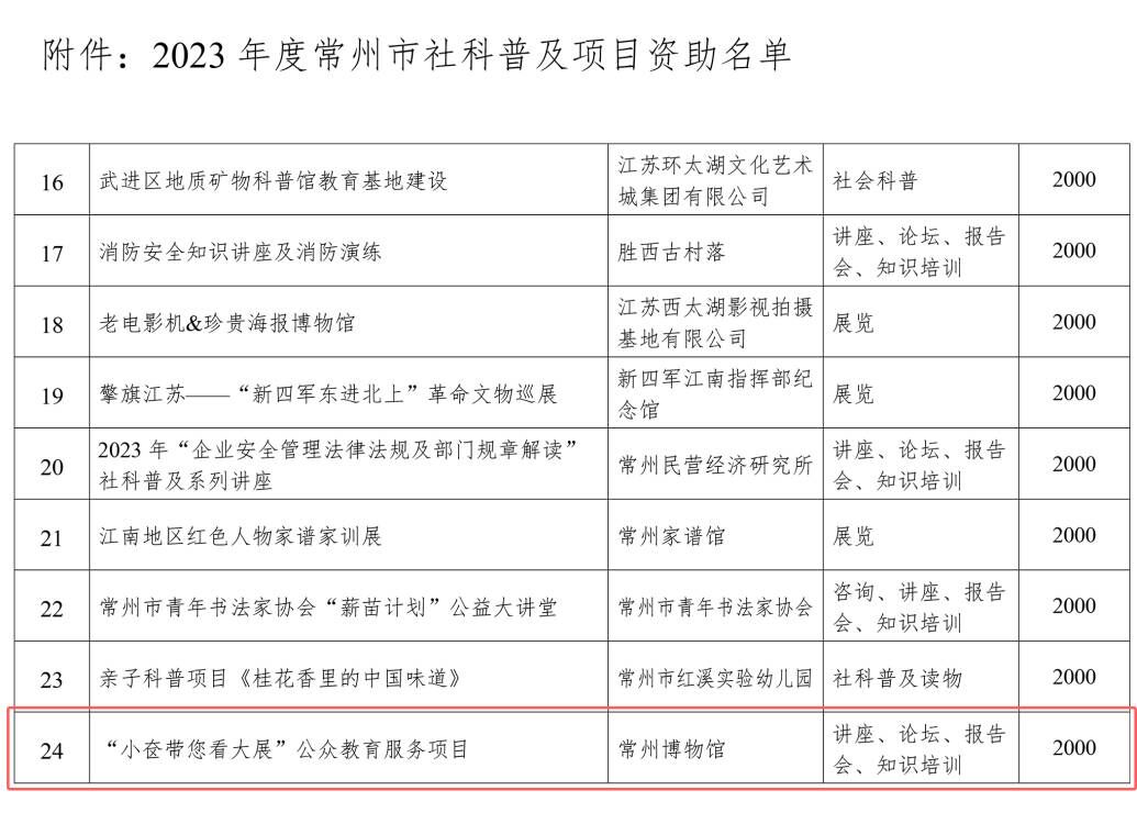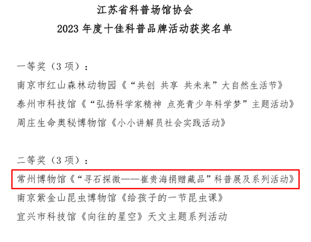 在常州博物馆教育团队的共同努力下,2023年共获得国家、省、市各级荣誉 6项。“‘龙•鸟’时光机”系列教育活动荣获第二届全国文博社教十佳案例、“常博奇妙夜”入选江苏省第二季“博物知旅”主题活动优秀案例、常州博物馆与常州开放大学联合申报的“文博知识进社区”馆校合作项目被省教育厅遴选为2023年江苏省社区教育特色品牌建设项目、“寻石探微——崔贵海先生捐赠藏品”科普展及系列活动获“江苏省科普场馆协会2023年度十佳科普品牌活动”二等奖、“小奁带您看大展”项目获常州市社科普及资助项目、常州博物馆与天宁社区培训学院联合申报的“常州市社区教育‘馆校合作’特色项目——文化赋能 幸福社区”项目结项获优秀。