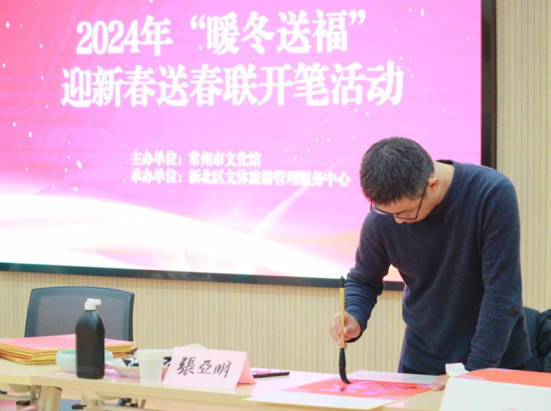 辰年启吉千重瑞,龙岁呈祥四季宁。1月11日下午,常州市文化馆邀请陈远东、景文静、张亚明、孙曙光四位书法家作为文化志愿者在新北区文化馆现场挥毫。此次活动由常州市文化馆主办,新北区文体旅游管理服务中心承办。春联福卡,祥云洒金,翰墨飘香,浓浓年味,饱含着对新年的憧憬和希冀,展示了书法传统文化的魅力,此次活动拉开了市文化馆“暖冬送福”迎新春送春联的序幕。