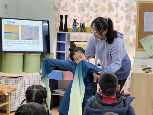 以常州博物馆藏宋代文物资源为依托,常州博物馆、常州市怀德苑幼儿园合作开展“品宋韵 承国风”寻宋系列活动。活动包含馆校双方开展课程研讨,教师给孩子们分享宋代的诗词歌舞、穿着服饰、运动游戏、美食雅物,孩子们体验拓印、画纸扇、下围棋、做茶点、打捶丸、投壶、蹴鞠,孩子们走进常博寻找宋文化等层层递进的环节,引导他们沉浸式感受宋代深厚的文化底蕴和独特的人文精神。