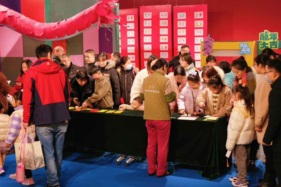 小龙人们现场抽签,“欣欣向龙”、“万事兴龙”、“龙运当头”……一个个关于“龙”的美好的成语和语句,2024年好兆头,新年上上签。