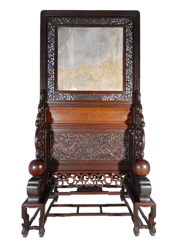 清 红木双狮戏球嵌云石插屏式座屏风