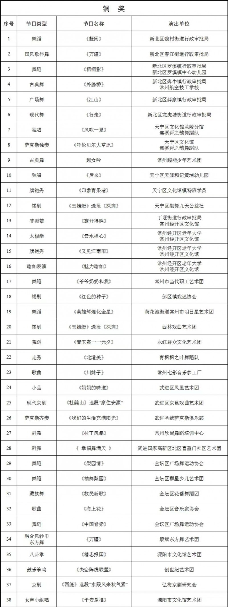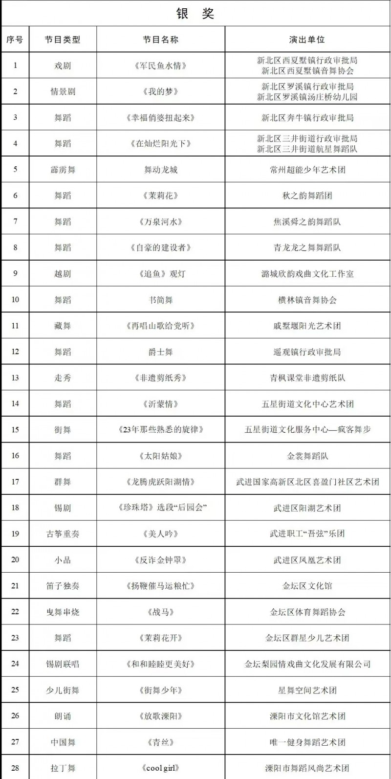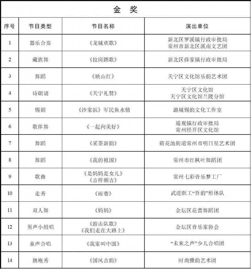 为进一步繁荣我市群众文化, 丰富群众精神文化生活, 营造 和谐美好的节日氛围, 中共常州市委宣传部、常州市文化广电和 旅游局、常州市文明办联合举办“ 我们的节日·春节”2024第十四届 “ 迎新春” 文艺展演,该活动共计8场演出,共评出14个金奖,28个银奖, 38个铜奖,充分展示了2023年群众文化活动成果以及文艺爱好者积极向上、多才多艺的风采,现将评奖结果予以公布。请各地积极开展文化惠民活动,通过丰富的群众文化活动提升群众的幸福感获得感,展现欢乐祥和的节庆氛围。