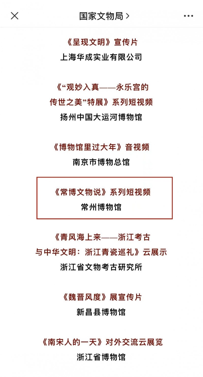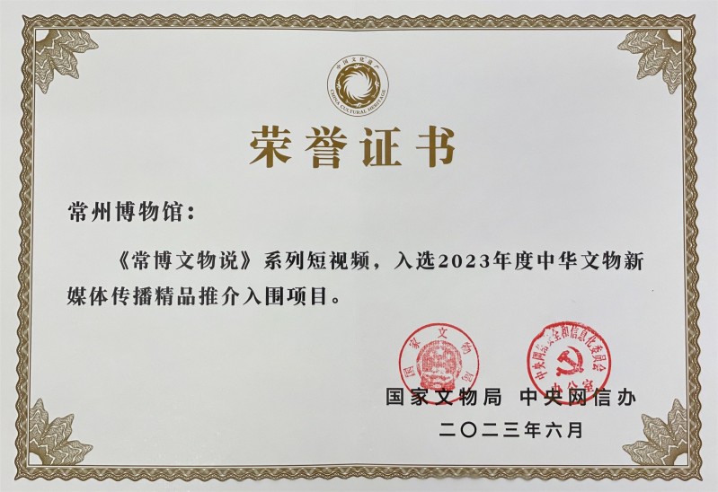 在2023年文化和自然遗产日主场城市活动开幕式上,国家文物局公布了2023年度中华文物新媒体传播精品推介精品项目和优秀项目等名单,常州博物馆策划制作的《常博文物说》系列短视频荣获2023年度中华文物新媒体传播精品推介入围项目,江苏省仅有3个作品入选。