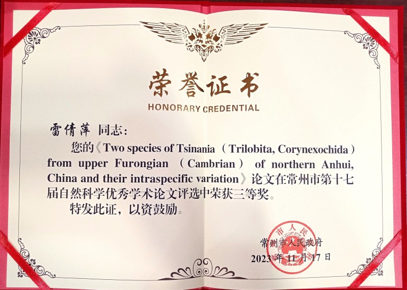 近年来,广大科技工作者坚持以习近平新时代中国特色社会主义思想为指导,紧紧围绕我市经济和社会发展的重点科技需求,积极开展科学研究,产生了一批自然科学优秀科研成果。为激励先进,经专家组评审、市评委会审定并公示,决定对191篇自然科学优秀学术论文予以表彰奖励。常州博物馆获奖论文是雷倩萍作为第一作者撰写的SCI论文《Two species of Tsinania (Trilobita, Corynexochida) from upper Furongian (Cambrian) of northern Anhui, China and their intraspecific variation》于2021年发表于国际学术期刊《Palaeoworld》第30卷第2期,该论文也是雷倩萍所承担已结项的国家自然科学基金青年项目(41802004)的代表性成果之一。