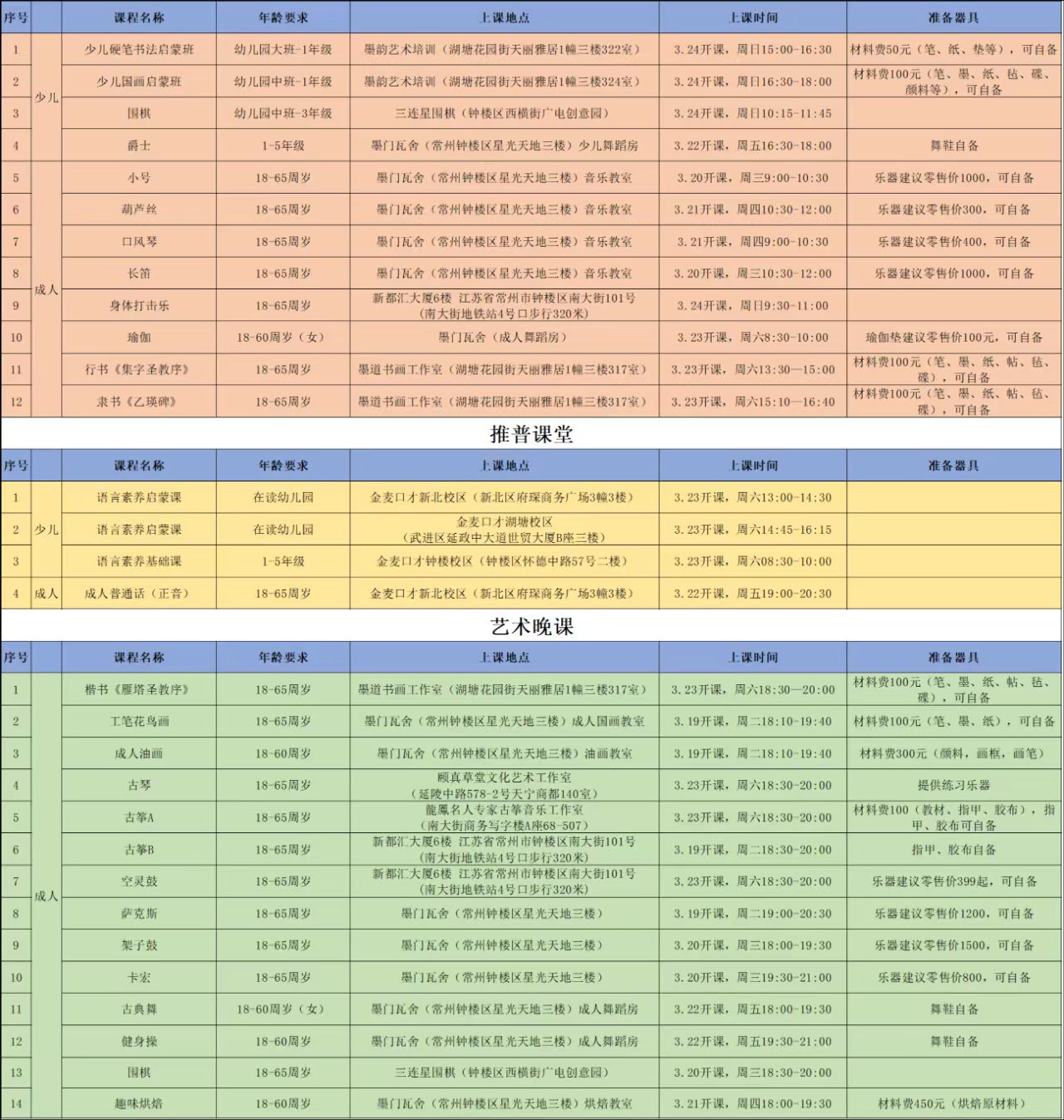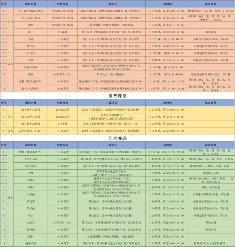 2024年春季常州市文化馆“市民艺术课堂”项目表