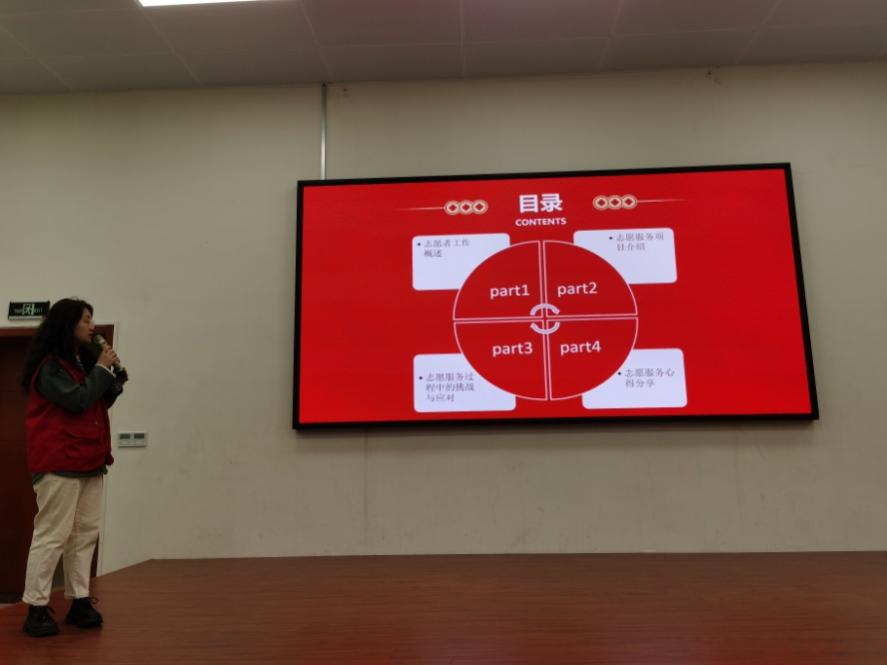 下午1点,面试会正式开始。首先,优秀志愿者代表周欣怡从“我是你的眼”志愿服务案例为切入口,为大家讲述志愿服务心得。周欣怡在过去一年,多次为三杰馆提供高质量志愿服务。
