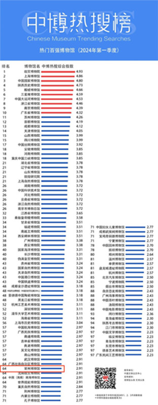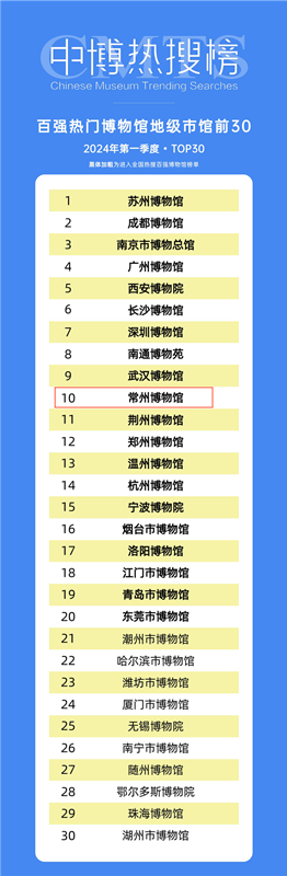 4月7日,由中国文物交流中心指导,博物馆头条统计发布的“中博热搜榜”发布2024年第一季度“热门百强博物馆”榜单,常州博物馆位列第64。