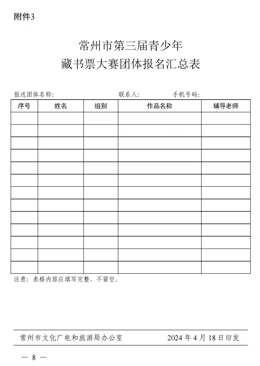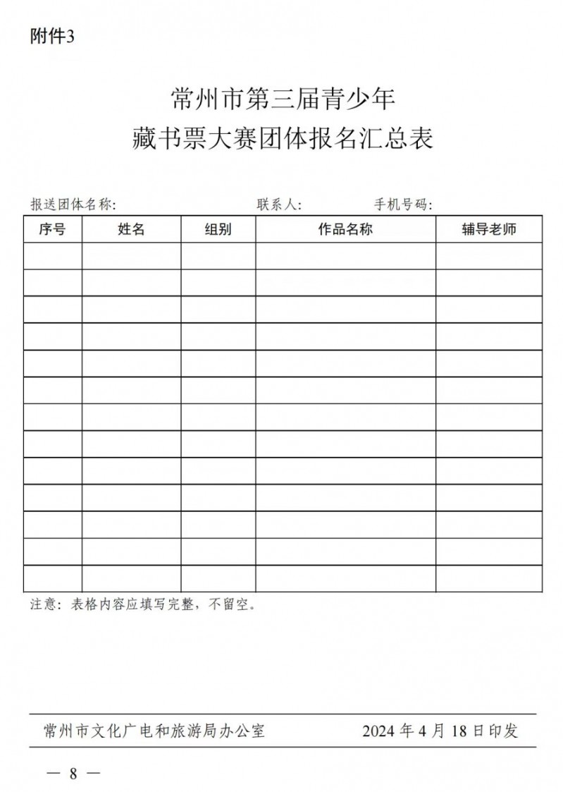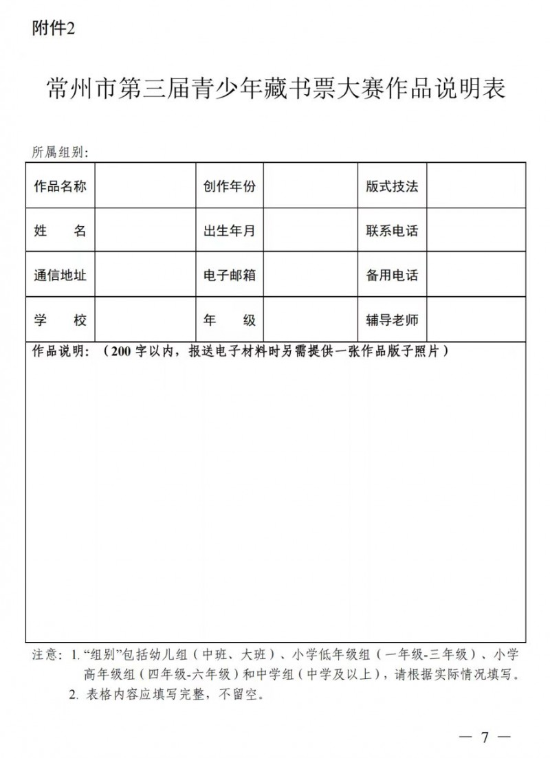 参赛个人或团体均需发送电子版材料至收稿邮箱,作品说明表需另附一张作品版子高清照片,邮件题目上应标注“常州市第三届青少年藏书票大赛——报送团体名(个人参赛的写作者姓名)”。以团体形式参赛的应填写团体报名汇总表(附件3),并将每个作品说明表及对应的版子照片按照汇总表中填写的顺序整理编号。