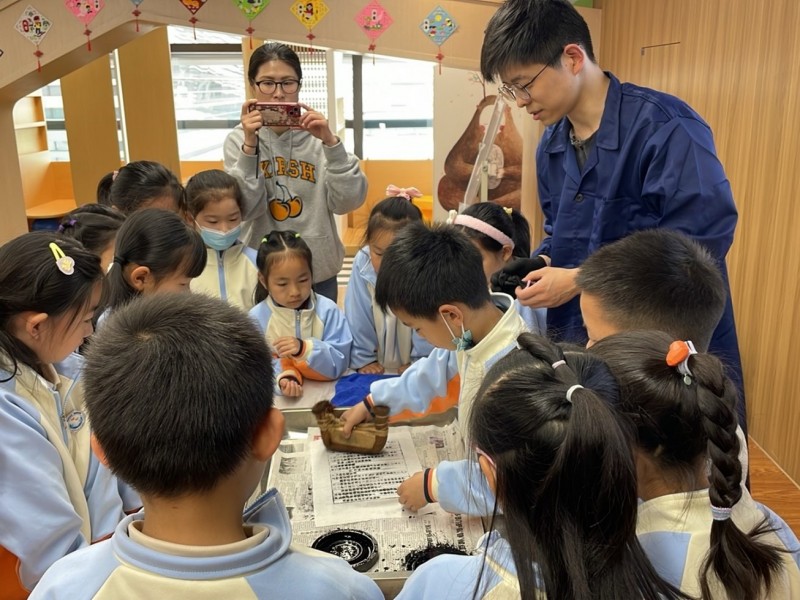 龙锦小学的40多名一年级小萌娃在老师的陪同下,怀揣着对知识的好奇与对阅读的热爱,在少儿部的馆员引领下,走进常州图书馆,开启了探索知识宝库的奇妙之旅。在此期间,孩子们了解图书馆的功能布局、图书分类及借阅流程。最令他们难忘的莫过于雕版印刷术的现场展示与实践。历史文献部馆员童心以其生动的讲解,引领孩子们穿越时空,追溯这项千年古技的历史脉络与文化内涵,揭示其在中华文明传播中的重要地位。为配合讲解,还精心安排了互动体验环节,孩子们轮流体验涂抹油墨、拓印纸张,沉浸于雕版印刷的工艺流程之中。这一独特的实践使孩子们在动手操作中感受传统技艺的魅力,领悟知识与技术的交融之美。
