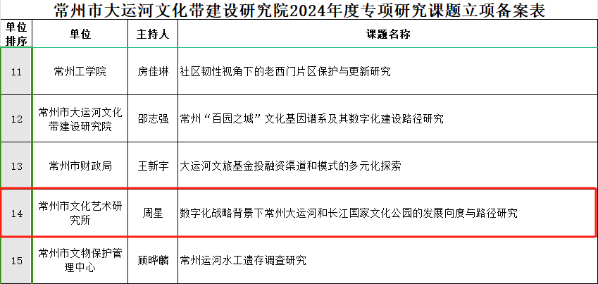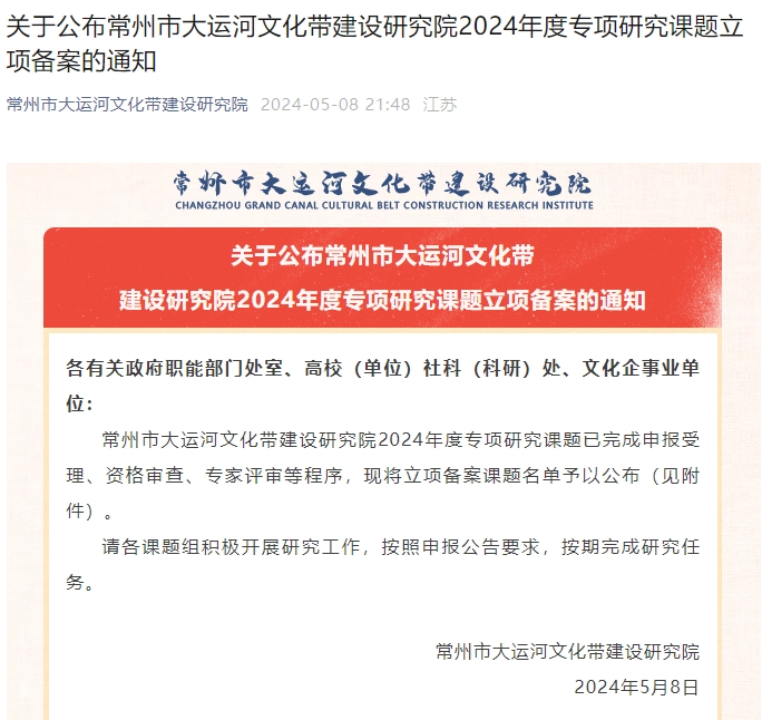 文研所申报课题获批2024年度常州市大运河文化带建设研究院专项研究课题立项