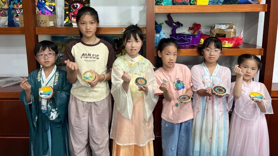 在老师们的精心指导下,孩子们动手动脑,分组完成了竹编小船、铜胎掐丝珐琅杯垫两种非遗作品。经过近两个小时的努力,一幅幅色彩鲜艳、精美立体的图案从孩子们的指尖跃然而出。活动最后,在漆扇创作体验环节,孩子们围在工作台前,全神贯注地跟随老师学习调漆、试色、漂浮、浸扇等关键步骤。当彩漆在水中缓缓扩散,形成一幅幅绚烂的图案时,现场爆发出一阵阵惊叹声。孩子们小心翼翼地将团扇放入水中,让扇面与漆色巧妙结合,每一步都透露出他们对传统工艺的尊重和对美的追求。孩子们不仅亲手制作出了独一无二的漆扇作品,更深刻地体会到了非物质文化遗产的独特魅力。