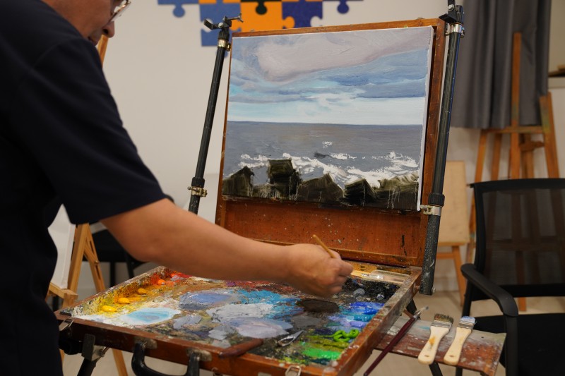 为纪念刘海粟先生“沧海一粟,壮丽一生”的广阔胸怀,本次学油画活动特意选取了一幅海景作为示范画进行临摹。美术馆的吴建宏老师先进行了详细的油画示范和教学,学员们在认真观看了吴老师的示范教学后进行临摹创作。整个绘画过程充满了专注与热情,学员们在吴老师的指导下,逐步掌握了油画的基本技法和色彩搭配。