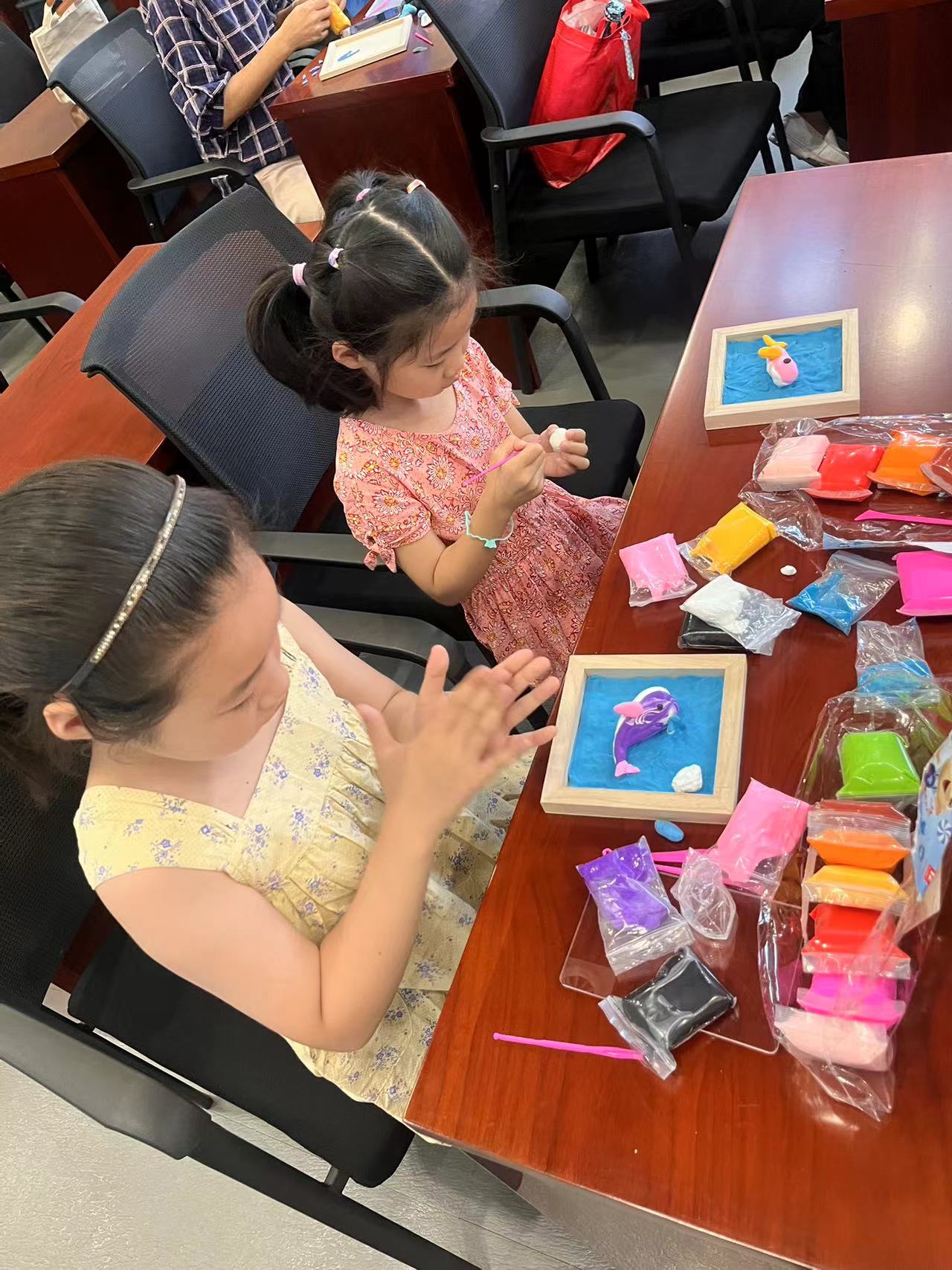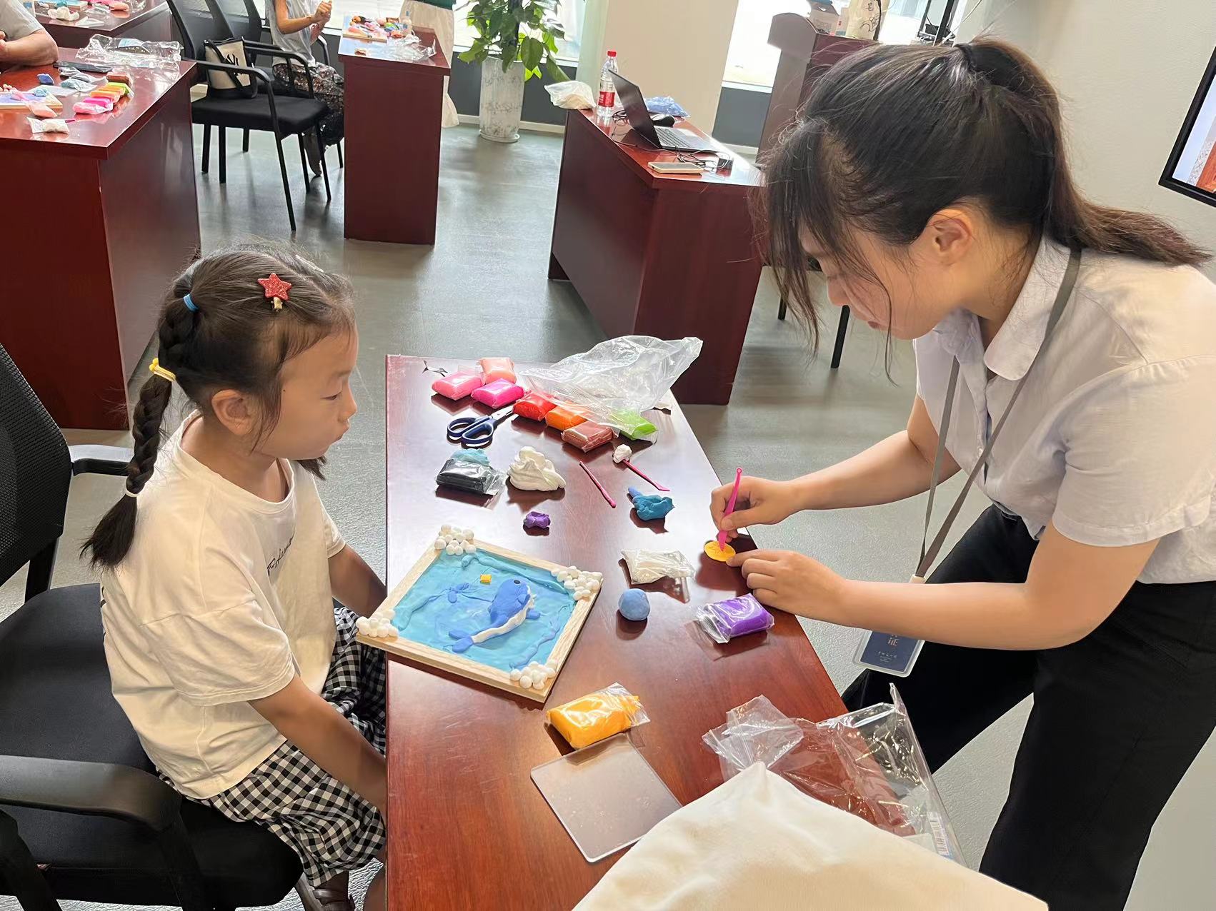 2024年7月26日上午,在细雨绵绵的夏日,常州美术馆的刘梦莹老师带领孩子们开启了“梦幻鲸鱼——超轻黏土”课程。这一课程基于昨日的讲座和实践基地参观,孩子们在了解海洋生物鲸鱼的知识后,利用超轻黏土创作出一幅幅立体的梦幻鲸鱼黏土画。这不仅加深了孩子们对鲸鱼的理解,也增强了他们保护海洋生物的意识。