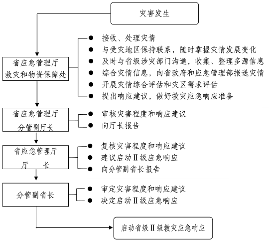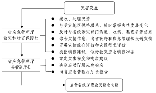 灾害发生后,省应急管理厅经分析评估,认定灾情达到启动标准,由省应急管理厅分管副厅长决定启动Ⅳ级响应,并向厅长报告。启动省级Ⅳ级救灾应急响应按照以下流程进行: