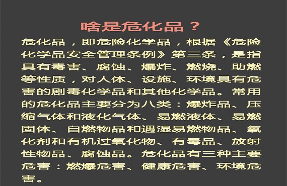 根据危险特性和类别,危化品的标志设主标志16种和副标志11种。如果我们见到多种危化品标志同时出现,说明有多种危险性,主标志标示主要危险性,副标志标示其他危险性。