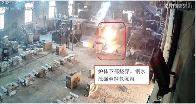 中频炉下部烧穿,钢水从中频炉泄漏至炉前钢包坑内,操作工停止了加热系统供电。随后,现场员工组织倾动中频炉,将中频炉内钢水转移至钢包内。