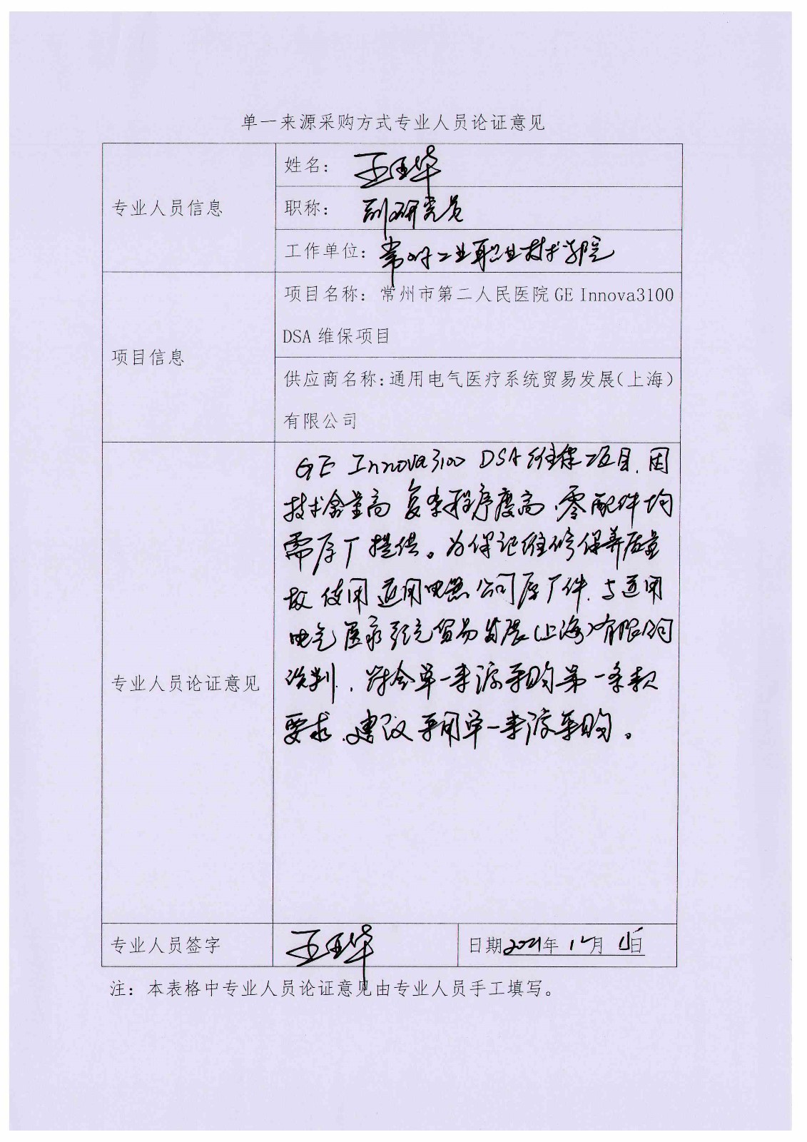 项目名称: 常州市第二人民医院GE Innova3100 DSA维保项目