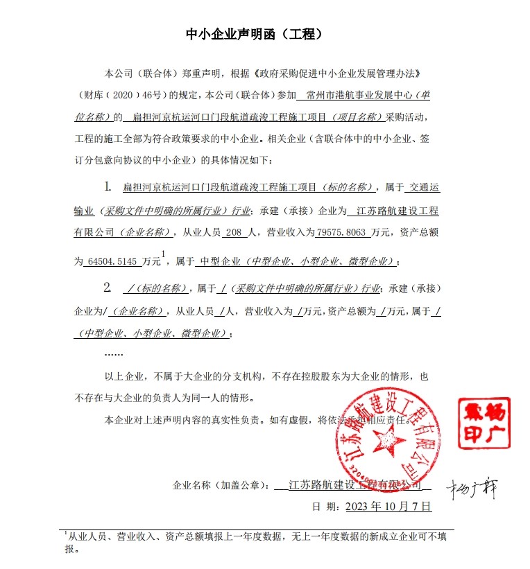 项目名称:扁担河京杭运河口门段航道疏浚工程施工项目