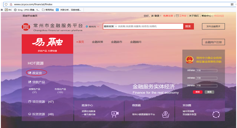 方式3:打开常州市金融服务平台-创新创业服务平台(http://www.czcycx.com/financial/fIndex)首页,点击政采贷,进行相关业务操作。