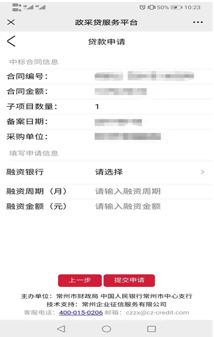 下方填写使用的贷款金额,点击提交申请,即完成线上贷款支用申请流程,等待银行用信审批。如涉及政府采购合同中收款账号的变更,企业需配合银行完成账号修改。