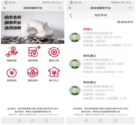 银行授信审核后,企业可接收到短信。进入主页面,点击“我的申请”,进入所有已申请银行贷款的界面。在我的申请版块,企业可查询已提交贷款的状态。状态主要有待审核、审核通过、审核拒绝、待确认。
