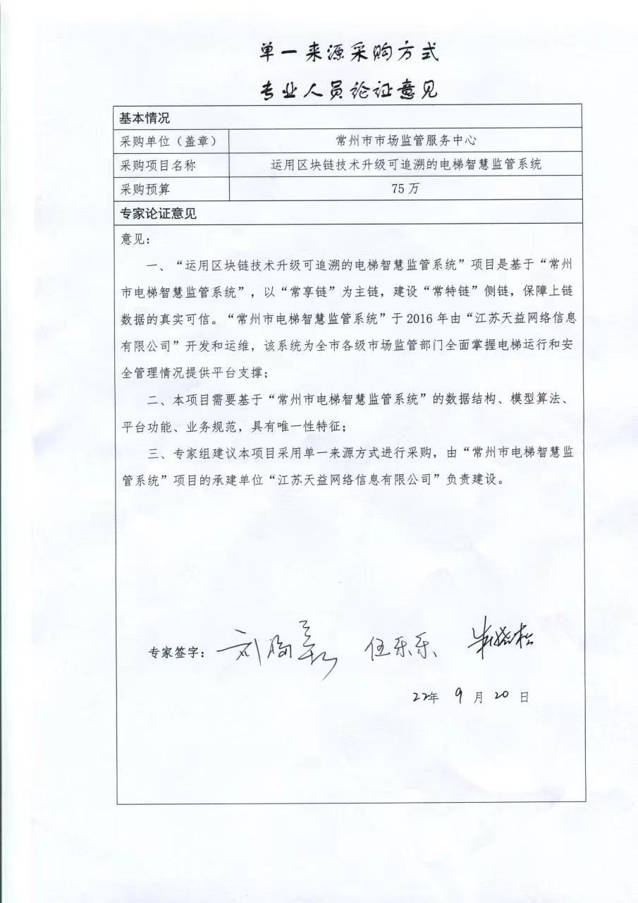 采用单一来源采购方式的原因及说明:本项目需要基于“常州市电梯智慧监管系统”的数据结构、模型算法、平台功能、业务规范,具有唯一性特征