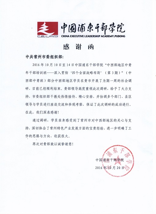 10月,中国浦东干部学院“中西部地区厅局级中青年干部培训班”部分学员来常围绕特色产业开展为期一周的专题社会调研。市委组织部协调市委党校、市发改委等多个部门及辖市区对调研活动给予大力支持,精心设计专题讲座、现场教学等环节,保障调研活动顺利进行。日前,浦东干部学院专门来函对调研期间常州市的组织安排表示感谢。