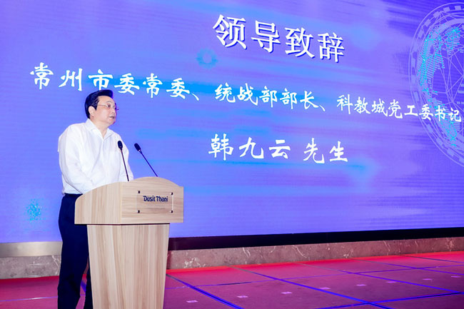 市委常委、统战部部长、科教城党工委书记韩九云在洽谈会上致辞。韩九云指出,要以本次海外人才常州创新创业洽谈会为契机,进一步深化创新体系的建设,优化创业服务支持,着力打造最优的营商环境和载体平台,为海外人才来常州施展才华,实现抱负提供全方位的优质服务。同时也热诚地欢迎各方英才、各类团队来常州创新创业,与常州人民一道共创美好的明天,相信通过共同努力,一定会实现创新创业人才和常州经济社会发展的共赢。