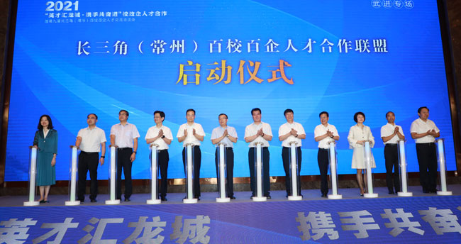 7月19日,2021年“英才汇龙城 携手共奋进”校政企人才合作暨第九届长三角(常州)百校百企人才交流洽谈会武进专场活动举行。省委教育工委副书记苏春海,省人力资源和社会保障厅副厅长顾潮,市委常委、组织部长季培东,副市长、武进区委书记李林等共同启动长三角(常州)百校百企人才合作联盟。