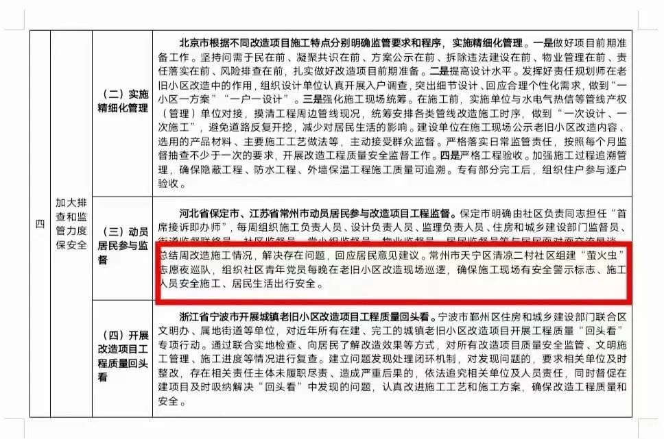 近日,住房和城乡建设部办公厅公布城镇老旧小区改造可复制政策机制清单(第五批),来自天宁区茶山街道清凉二村社区的“萤火虫”志愿夜巡队光荣上榜。