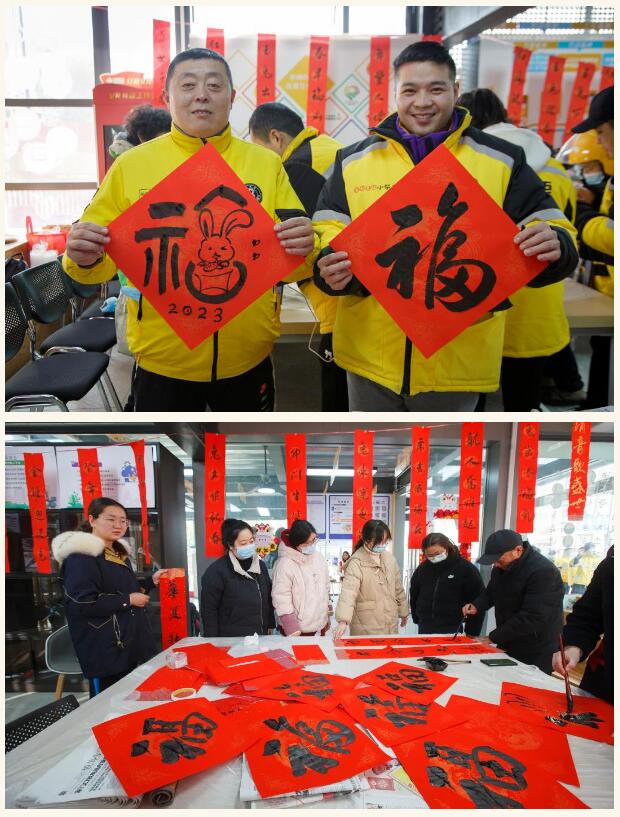 常州市书法家协会青少年书法院的书法老师们挥毫泼墨、倾情书写,为参加活动的骑手“量身定制”一幅幅喜庆的春联。