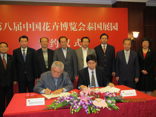 4月12日下午,第八届中国花博会泰国展园签约仪式在富都盛贸酒店龙城阁隆重举行。泰国中华总商会常务发展丁文志先生与花博会事务协调局局长金刚共同在协议书上签字。常州市政协副主席朱剑伟、市国际友好交流协会会长薛锋、市政协港澳台侨与外事委主任王燕萍、市侨办及武进区的领导在场见证。至此,泰国中华总商会成为第一家代表参展国参展的华人社团。