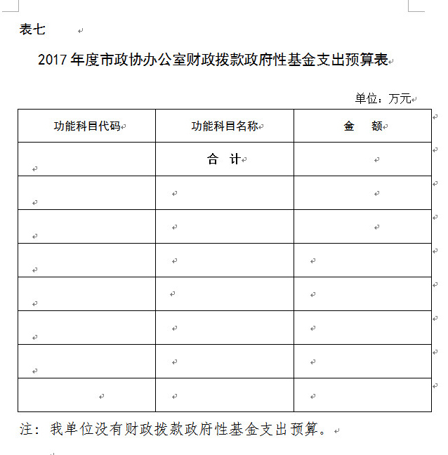 本表反映部门年度政府性基金支出预算安排情况。我单位没有安排政府性基金支出预算,此表为空白表。