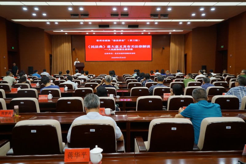 十三届全国人大三次会议审议通过了《中华人民共和国民法典》,这是新中国成立以来第一部以“法典”命名的法律。学习宣传贯彻实施好民法典,对于有效化解当前发展面临的矛盾问题、做好“六稳”“六保”工作、推动常州高质量发展走在前列具有重大意义。本期讲堂就《民法典》出台的背景、意义、主要内容等进行解读,旨在深入学习习近平总书记在中央政治局第二十次集体学习时的重要讲话精神,深刻认识民法典立法的重要意义,教育引导全市政协委员进一步增强法治思维和法治意识,更好地为服务常州“五大明星城”建设和推进法治常州建设履职建言做出积极的贡献。本期讲堂得到《人民政协报》大力支持。 130余名政协委员和市民聆听了讲座。