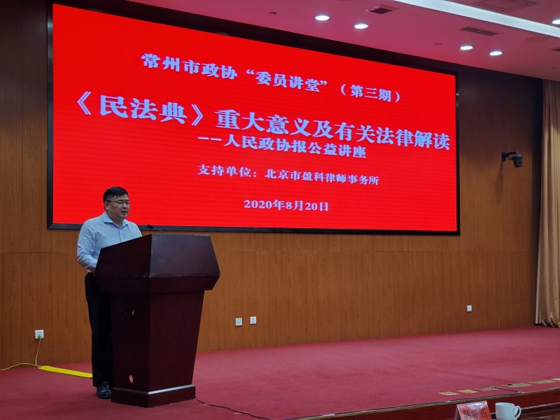 8月20日下午,市政协在市行政中心群贤堂举行第三期“委员讲堂”活动,北京市盈科律师事务所全球董事会主任、全国律师协会政府法律专业委员会委员、清华大学法学院法硕联合导师梅向荣,北京市盈科(常州)律师事务所管委会主任、江苏省律师协会理事郝秀凤进行《民法典》解读。