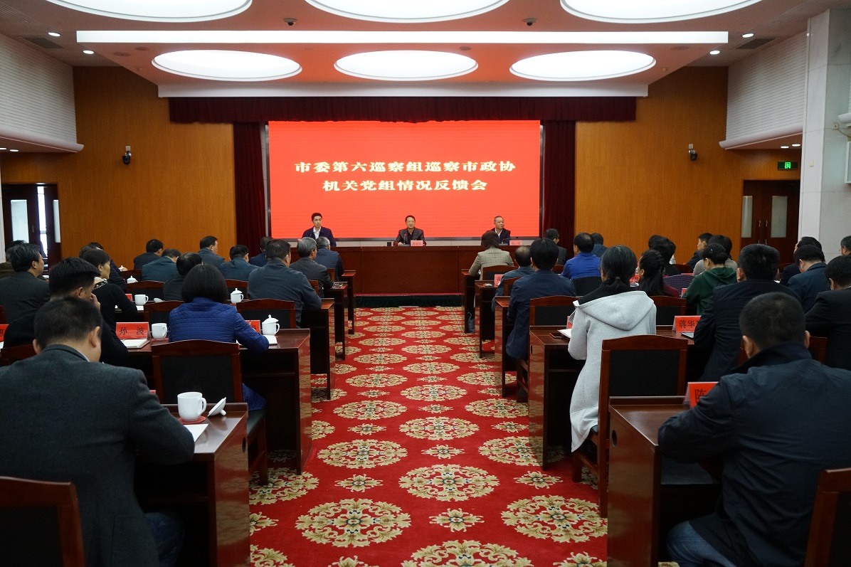 根据市委统一部署,2020年8月24日至10月30日,市委第六巡察组对市政协机关党组开展了政治巡察,通过听取汇报、个别访谈、走访调研、调阅资料等方式,广泛深入地了解情况、听取意见,形成了全面客观公正的巡察反馈意见。巡察发现并反馈的问题是:学习贯彻习近平新时代中国特色社会主义思想和党的十九大精神不够到位、履行政协机关职责使命不够到位、落实意识形态工作责任制不够到位、抓作风效能建设持续发力不够、党的组织建设存在薄弱环节、干部队伍建设存在短板等需要整改的内容,并提出4条整改建议:一是要树牢一线意识,在加强自身建设上下功夫;二是要体现一线服务,在促进建言资政上聚合力;三是要加强一线管理,在提高监督水平上提质效;四是要夯实一线根基,在全面从严治党上谋过硬。